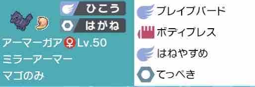 後半に増えていたホルード入りの対面構築には、ノクスから入って裏のアーマーガアに引く動きがかなり安定していて、その時も基本初手に置いてました